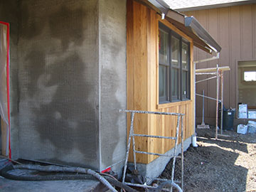 By late morning the sun began to come out and the scratch coat on the cottage was drying out. You can’t see in this picture, but it has scratches in it—which I imagine is why it is called the scratch coat. Next will go on the brown coat. |
