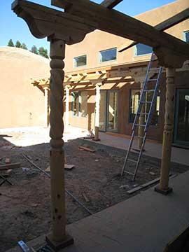 Inside the courtyard, things were starting to look very good, although we are still missing two sections of beam. For some reason, we are two pieces short on our shipment from New Mexico, and of course did not notice it until we went to put them up. | |