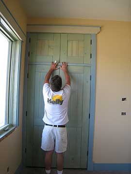Kai mocked up the head trim for us to approve. (Head trim is the the trim at the top of doors or windows.) Here is the guest room closet with cupboard above and head trim above that. The gray wood is primed but not painted yet. It will be painted the same turquoise as the rest of the painted trim when it all gets caulked, sanded, and a second coat of paint. I had worked hard on these details with the drafting architect at Todd’s office and we had put a lot of thought into how we wanted it to look. In real life, it just looks great. |