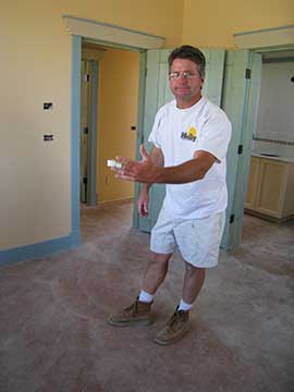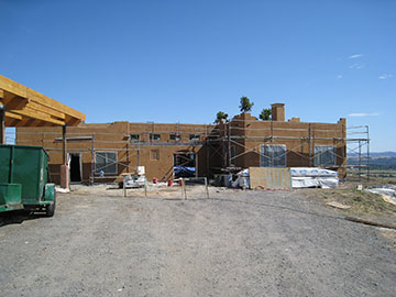 When I got to the site today, the plasterers had finished the color coat over the whole front of the house. It looks wonderful, just like the brown buildings we loved in Santa Fe. In front of the house, there are a couple of sawhorses and off to the right is a board in the road. These are to protect the wires re-hooking the upper well up to the water system. The electrician had stayed late last night to reattach the well temporarily and when I checked the level in the water tank, it was almost full. |
