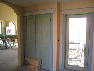 The guest bedroom hallway has a lot of trim in it because of the number of doors: guest bath, guest bedroom, linen closet, library, and foyer window. The dinky little linen closet will come in handy for towels and sheets for guests. We originally had more space in this wing, but due to cost considerations, the house when on the Great Diet and lost a couple hundred square feet. Sadly, the large linen closet was part of the sacrifice. |