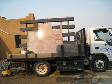When I arrived at the site, the crew from the granite fabricators had already arrived and started installing the granite in the kitchen and dining room. Here are some of the counter top pieces still sitting on the truck. |