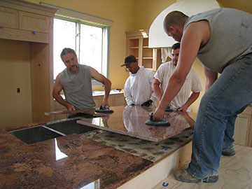 I took a bunch of pix of the installation process. I always get a kick out of watching men do one of the [2] things they do best—which is totin’ and haulin’. Here is the crew carrying in the largest top of the island piece, which took four strong men to heft. The blobs on the sub-top are mastic. |