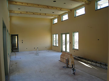 In this photo, you see light coming through the clerestory windows and the lower windows in the living room. Once the walkway roof is installed, there will only be the clerestory light in the morning—a trade-off for shelter along the walkway during the rain. | |