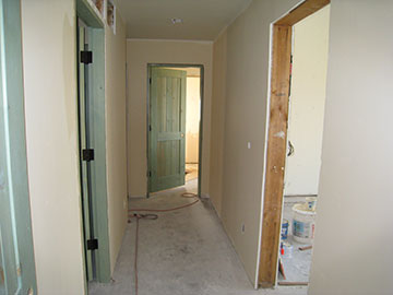Here is the kitchen/family room with its final coat of paint. The doorway to the master suite looks kind of odd crammed so far over to the left side of that big wall. I have worried about that ever since I first saw the elevations. However unless we made the hall behind it wider—which meant taking space out of the master bedroom—there was no way to move it over. I am hoping with the trim and furniture on that back wall, that it won’t look so odd. |