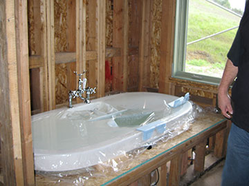 A lot was going on today, but it was not very photogenic, so this is a very short page. The most exciting thing is that the master bathtub was installed. Kai turned it on for us and it bubbles great—much better than I had expected. With a concrete floor, you have to choose the tub before the floor is poured because the plumber needs to know where to put the drain in relation to the tub. I had found this airbath tub that I liked, for what seemed like a decent price. But I hadn’t seen in it person—just on the internet—and hadn’t talked to anyone in any of the bath and kitchen stores, so I bought it sight unseen. I wish I had known more about tubs and faucets because finding a faucet to fit this tub was very difficult. |