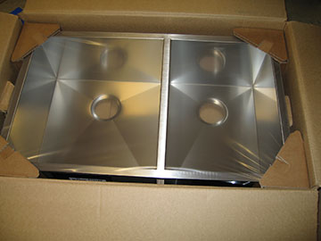 Our kitchen sink arrived from, wait for it, Costco! This is a very snazzy Blanco sink, and again, I bought it from a 2 inch square, low resolution photo on the net. Luckily, I think I will love this sink. The main requirement was that it be DEEP. I am so sick of getting splashed while trying to dunk a big pan in the sink. Jim and I wanted a sink we could immerse a really big pot in. I wanted a divided sink and Jim wanted a single bowl. I won on this sink, but of course the all-important prep-sink will be single bowl. When we were leaving today, we caught up with the UPS truck at the bottom of the hill with the other sink in it. It matches this one and is equally as nice. |
