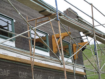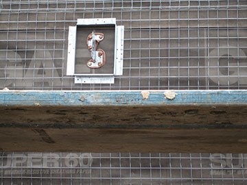 This shot seems incomprehensible, but is actually kind of interesting. The silver thing at an angle on the wall is flashing for the corrugated steel roof over the walkway and the square thing below it is the bracket for the beam to hold up the roof. There was a certain amount of discussion over whether the courtyard walkway beams needed to be attached to the wall or whether they could just come very close. |