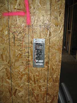 The totally excellent electricians managed to get the switches for the master bathroom right where I wanted them. Behind that piece of OSB on the wall, the studs are packed in solid for about 18". Because of that, the electricians had wanted to move the switches out of the photo to the left. We would have had to come into the bathroom and fumble around on the wall to turn on the lights. I strongly objected to this and through my weight around just a bit, which resulted in getting the switch put where it needed to be. They had to route out a hole in a 10" x 10" stud and drill through a bunch of others to get the wires there, but they managed to do it. I just imagined too many nights stumbling to the bathroom in the dark and dealing with that light switch. Yikes! I am so glad they were able to get it done the way I wanted. |