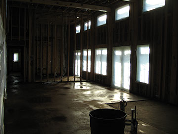 The ghostly morning light of the fog shines through plastic covering the dining room windows. The mold spray was done on Tuesday. This borate based spray will kill mold on the wood of the structure and also protect it against termites. It is completely inert and non-toxic. We had it done on the barn and cottage last spring because of big mold issues and I decided to add it to the house contract too. And lucky I did, because, with framing during the winter rains, we have developed a little mold in this structure as well. The spraying requires that all the windows be protected from spray and that the floor protection be taken up. |