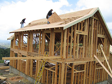 Here you can see the sheathing on the north side of the barn. The framers put those temporary strips on so they have something to stand on while they are nailing. They will be removed before the shingles are put on. |