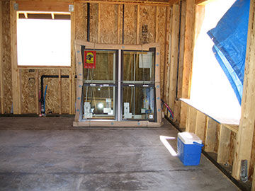 Here are some more windows in the kitchen. We are in the process of trying to get the kitchen cabinets built within budget. I had originally planned to use Ikea cabinets, but because we did not plan the kitchen around their module sizes and our space is so tight, we can’t use them. I have found a very nice bathroom sink on a stand for the bathroom—and within budget too—to take the place of a cheesy vanity. Thank goodness I insisted on having a linen closet in the bathroom! |