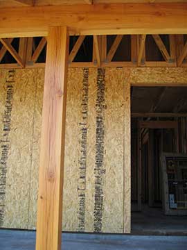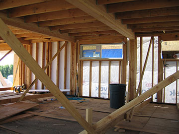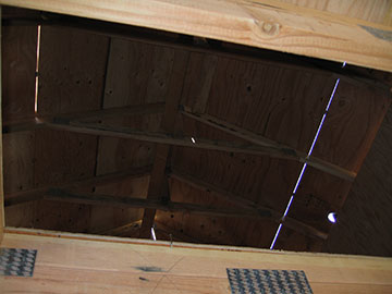 Here is yet another view of the attic space. I found out why they use the little spacers between the sheets of roof sheathing: when the wood expands from the hot sun, if the sheets butt up against each other, they bubble up. It is so amazing seeing a building go together. Something we think of as completely solid—like a wall—has parts that work together and is really not solid at all, kind of like the Newtonian universe vs. the quantum universe. |