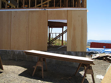 Here is another view of the sheathing. The barn door looks so small, because Kai did not have the exact size for it. He lopped the siding over into the door space and will cut it back when the door spec arrives. I gave them a spec weeks ago, but I guess the word has not been passed along yet. Perhaps it is stalled with the rest of the door order, which is being held up by the cottage door. I keep picking what I think are very simple doors from the supplier’s website, only to find out that each one is a custom door with a high price and a long lead time. We will see what we end up with. All I know is that I don’t want a simulated wood-grained formica door! |