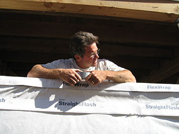 Here is Kai leaning out the window and kibitzing over duck tape. He had just turned his head to give his helper an instruction when I took this picture. Not long after that, the plaster contractor arrived. We discussed the way the plaster would be installed on the guest cottage. He is a very interesting guy. I explained to him that I wanted the plaster to look like the buildings in downtown Santa Fe, NM and asked if he had been there. Not only had he, but his wife is from a small town near there, so he understands what I am talking about. I only hope I can stick to my guns about cost (not too likely) since he has some very beautiful ideas about how to do the house. |