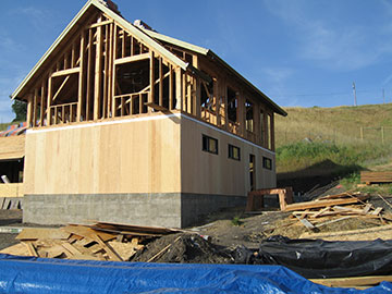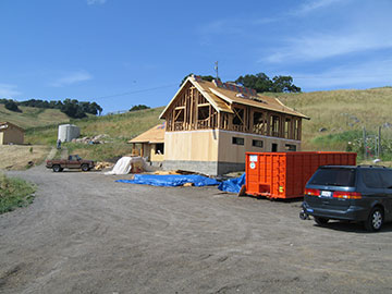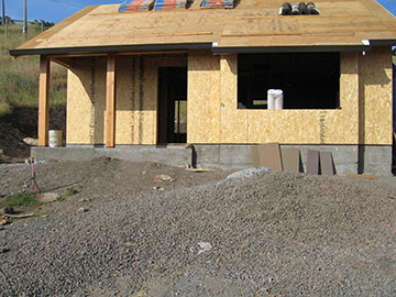 In this shot of the guest cottage, you can see what I did after the crew left—worked on selecting an exterior color. Those boards of different colors of brown propped up against the front of the slab are various colors we are trying out. |