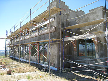 This is the little porch outside the foyer and the back of the chimney. You can get a better feeling for the rounded corners now that the stucco has been applied. I can’t wait for the scaffold to be removed so we can get a good look at this section of the house. |