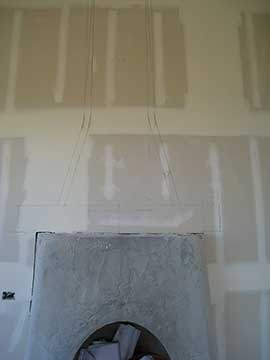 Inside, Kai and I brainstormed on the “chimney.” Jim and I had gotten a fireplace drawing from Todd with some elements that we really liked, but Jim thought the over-all look was too rustic for the space. We decided to combine the mantle from Todd’s drawing with the chimney in the fireplace drawing from his office in December. That drawing had an expressed chimney (which is a nice way of saying fake) that slanted in from the top of the fireplace and then went straight up. Kai took measurements of the firebox aperture and got a middle dimension from that. He then drew the mantle and chimney on the wall.