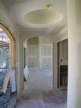 The drywall crew was busy putting the finish coat on all the walls, starting from the back door. How much lighter the hall looks with the creamy white mud on it. | |