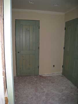 Here is my dressing room with doors and primed walls. We will keep the paint essentially the same color as the primer for the back rooms and hall, but I am going to adjust the trim color to a greener tone back here. We want the lighter color for the smaller spaces with lower ceilings, where the orange would feel too dark. | |