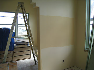 Here is the darker, orangy color which I had mixed up from my original selections. After seeing the house primed, I realized that when I saw the samples against all the white drywall, the orange had looked very dark in contract. After seeing the rooms primed, I now realize that the large rooms can easily take the darker paint without it seeming dark. Plus, the painted trim and stained wood look great with this color and not so great with the yellow. The painting contractor is calling this color “Susan the Peach,” although I think it is orange. In real life, it does look darker than this photo. I am not sure whether to be flattered or insulted by the paint name, and he’s not saying whether he meant to flatter or dis. When I asked, he just laughed. |