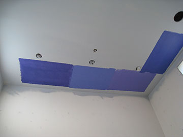 We picked out a color for the master bedroom ceiling. It is the second blue from the left. They all look better on my computer monitor than in real life, but the color from monitor to monitor is so different, I have no idea what it will look like on yours. (The black hole in the ceiling is for a stereo speaker.) |