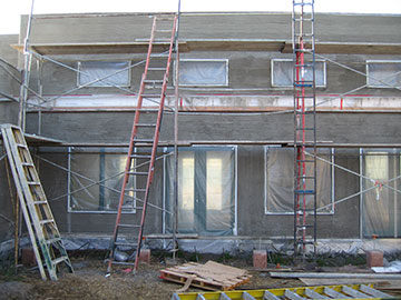 I arrived about 7:30 am, and was greeted by the sight of the house covered with stucco. This is the first coat of stucco, called the scratch coat and you will see why when you look at a close-up.