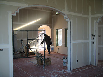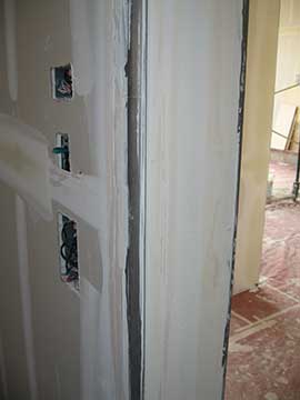 Here is a detail of one the arches showing the corner treatment and all the switches. Notice how clean and tidy the holes for the switches are. This shows the care with which was this drywall installed. It doesn’t seem like that big of a deal until you have seen painters using spackle to patch around switch plate holes that are not so carefully cut. These don’t look like they will need any spackle at all. |
