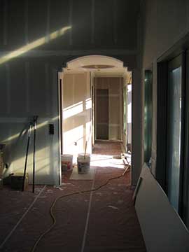 Now they will cover the entire wall with mud and trowel it. This is the foyer from the living room. | |