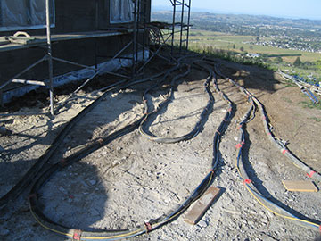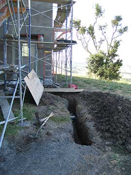 The ditch for the electrical hook-up got a little longer, but it still has to cross the road to the big electrical vault by the rocks on the north side of the guest bedroom. | |