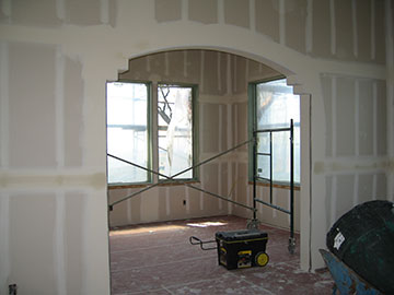 Here is the coffer in the foyer with the second layer of finish on the drywall. This crew is so careful and tidy, I am very impressed. I watched them work on the ceiling in the family room using a special tool which looked kind of like a carpet sweeper to spread mud in an even stripe on the ceiling. What a difference from slapping it on with a trowel any old way! |