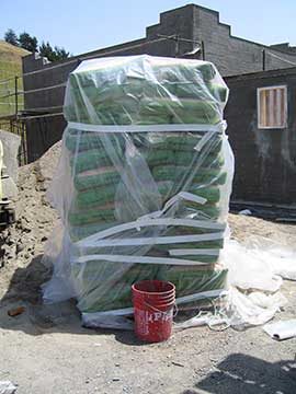 Right before our ill-fated trip to the stone yard, the stucco crew pulled up with equipment for Monday and another load of cement. We are now the proud owners of the Great Column ’o Cement! It’s hard to tell from the photo, but it’s taller than I am. | |