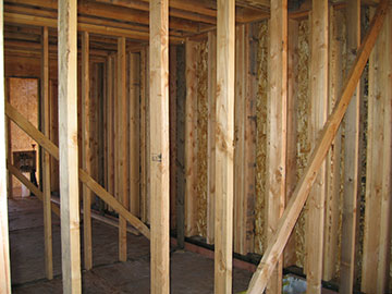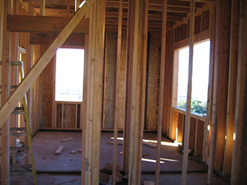 The guest bedroom has been sheathed and feels bigger than I thought it would. The view is great from both windows. We didn’t put large windows on the west side because of the heat in the summer. The living room and dining room have roll-down shutters to protect the house from heating up, but they are very expensive and so this room will not get one. Hopefully, the large window looking to the north will compensate for the lack of a panoramic western view. |