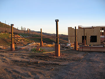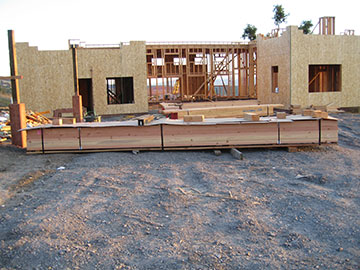 Today, they were working on sheathing the back of the house. They have the scaffold on the outside now and have gotten half way down the family room. | |