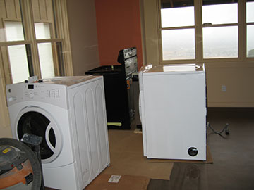Kai also moved all the appliances down from the shed where they had been stored since early this summer. He wanted to make sure that everything was intact and ready to install. The washer (facing the camera) and dryer will stack and go in the little closet with the louvered doors in the kitchen.The brown thing in the corner is the stove. All of these appliances are GE, which we got a very good deal on because of our business connections. I will be interested to see how well they function, since I have not been a big fan of GE appliances manufactured under the previous CEO. |