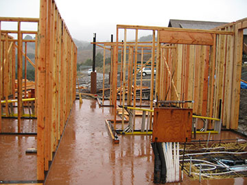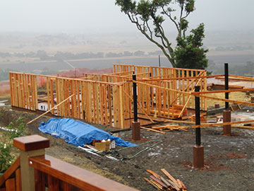 My assistant was on the job when I arrived and after talking to him, and touring the cottage with Kai, I decided to go over to the house and take some photos. Of course, by this time, it was raining furiously and I got completely soaked. The reason this picture is a little red at the lower corner is because I was trying to shelter the camera from the rain and that is a little of my hand in the way. This does give a pretty good view of the progress so far, though. They have started framing from the back door, working toward the master bedroom. The two diagonal pieces of wood at the front end of the framing are holding the walls of the wine closet and Jim’s office up. In between will be the central hallway from the back door. |