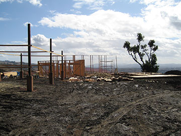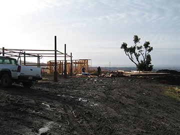 Here you see the scaffolding the framers have set up to frame the tall parts of the house. The public rooms all have very tall ceilings—13.5'. There will be clerestory windows in the living room the kitchen/family room and the master bedroom to aid in flushing heat during hot weather. These high windows will also let in light to rooms where the regular windows are shaded by veranda or walkway roofs and keep the rooms from seeming too gloomy in the winter. After the grading contractor there was a meeting, lunch and another meeting. |
