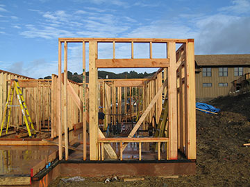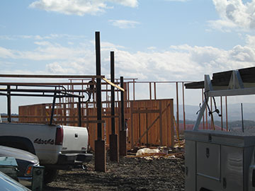 By the time we got back up to the top, it was time for another round of meetings. The framing crew was starting to work on the high walls for the master bedroom and the kitchen/family room. Wow, are they tall! Things always look weird while they are being built, but really, they are tall. That section of the building is designed to show from the front above the lower utility wing toward the carport. |