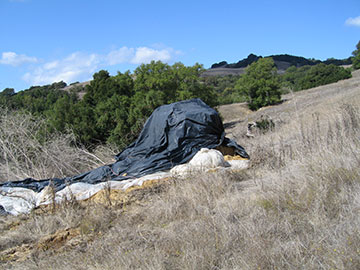 Between lunch and meetings, Kai and I took a trip down the hill to put the tarp back over the straw bales stored below. I took this picture from below the dam. I have massive archives of photos from building the dam but I am not sure that I have any pictures from this location in the website. What you are looking at was all terraformed. The bay tree at the top of the picture is up on a cliff just below the house, which is mostly hidden behind our dam. The road curving down from the left into the foreground was all built up from nothing. The ground were the dam is was a huge slide and all that dirt was removed to below where I am standing and put back in. The lower section of the dam acts as an earthen buttress to keep the dirt above from sliding again, then rises higher to contain our pond. |