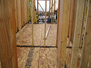 Standing in the kitchen, right about where the stove will be, I am looking down the kitchen family room toward the master bedroom. The sill for the master bedroom wall is even more visible in this shot. They haven’t put plywood on the floor around the plumbing directly in front of me, since that area will be under the center island in the kitchen and won’t show. The depressed area is for the cork flooring to soften the kitchen floor. |