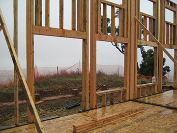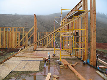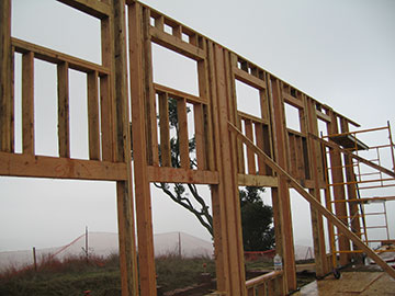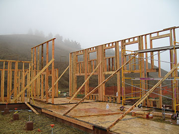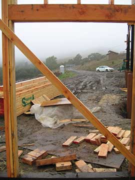 It rained so hard that the crew didn’t show up today. They are going to work tomorrow (Saturday) instead—when presumably it has dried out more. I had gone to Kai’s office to help put together orders for materials we are getting from several companies in New Mexico. We will be ordering carved pine columns, large pine beams, carved corbels and half-corbels and some other lumber. Afterwards, I came by the job to take pictures. The crew had worked enough the previous day to finish some more on the framing of the master bedroom/kitchen/family room walls. I took this picture from the back door of the barn. |