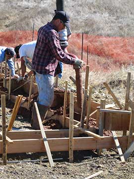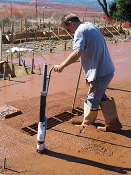 Here you get a good shot of how they level the slab. The board on the left is sitting on wires which are hooked to pieces of rebar thrust through the void-form into the ground. The wires have been leveled off in advance using a string across the forms. The concrete is pumped into the space between the form and the board and then screeded flat with a piece of 2 x 4 run between the board in the foreground and form edge. |