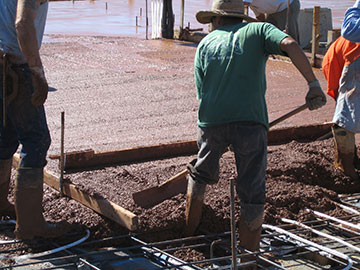 Once they finished pouring the main house slab, the pump crew went on to pour the footings for the veranda slab and courtyard walkways. These slabs will be a sandy yellow and poured later but the bases for the columns will be red and stick up through the yellow slabs. |