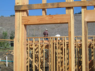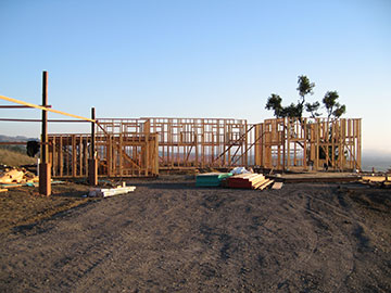 This morning I arrived at the site about 7:40 am in a dense fog. Everything was very ghostly—appropriate for Halloween. The crew was at work putting rafters on the east wing of the house. | |