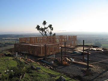 About 1pm, the sun came out. The temperature suddenly shot up 10 degrees, from 63 to 75 and I had to take off my fleece vest. As you can see, the sky is blue as can be. Thomas, the framing chief, was back from his hunting trip to take charge of the crew. (He is the one wearing the white hat.) I understand from Kai, that they will work on rafters for a while before they finish framing the guest room and library. |