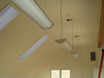 These fixtures go down the middle of the ceiling and I think they are very handsome. The electrician found them as a substitute for some ridiculously expensive fixtures. They have little perforations which the light shines through. | |