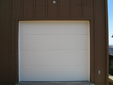 One thing that has been a problem is the garage door on the barn. I had wanted to have a corrugated steel door, but they don’t seal very well. Since rodents are a big problem at the site, I wanted a door that sealed up when it was closed to keep mice out. (Our cross-the-street neighbor told me he lost once lost 3/4 of some storage to mouse depredations.) Janver—at my request—ordered a smooth garage door. When it came, it was textured in a hideous, fake wood texture (see close-up below). When he called the company, it turns out that they do not make a truly smooth door, the rep just thought Janver meant no raised panels.