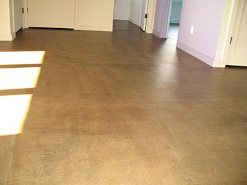 Here is a shot from the same view—through the guest bedroom closet to the living and dining rooms—that I took before the pour and again the concrete wet. In this light you can see the buff marks from the final troweling, but if you look directly at the slab, they don’t really show. | |
