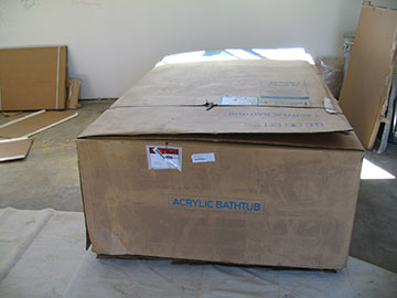 As you can see by the label on this box, this is our bathtub. It is a fabulous Toto air-bath. I am dying to look in the box at it. Maybe Friday I will get to it. |
