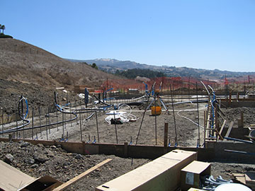 I came up to the site on Tuesday, because the plumber and the radiant heat contractor had questions for me before they could do their work—particularly the radiant heat contractor. He had drawn a plan of the system, but somehow I had not gotten a copy of it and needed to approve where the thermostats and manifolds would go. Here you see the situation when I got to the job. All that tubing is waiting to be installed. You can also see the tops of the completed grade-beams with the rebar sticking out of them. |